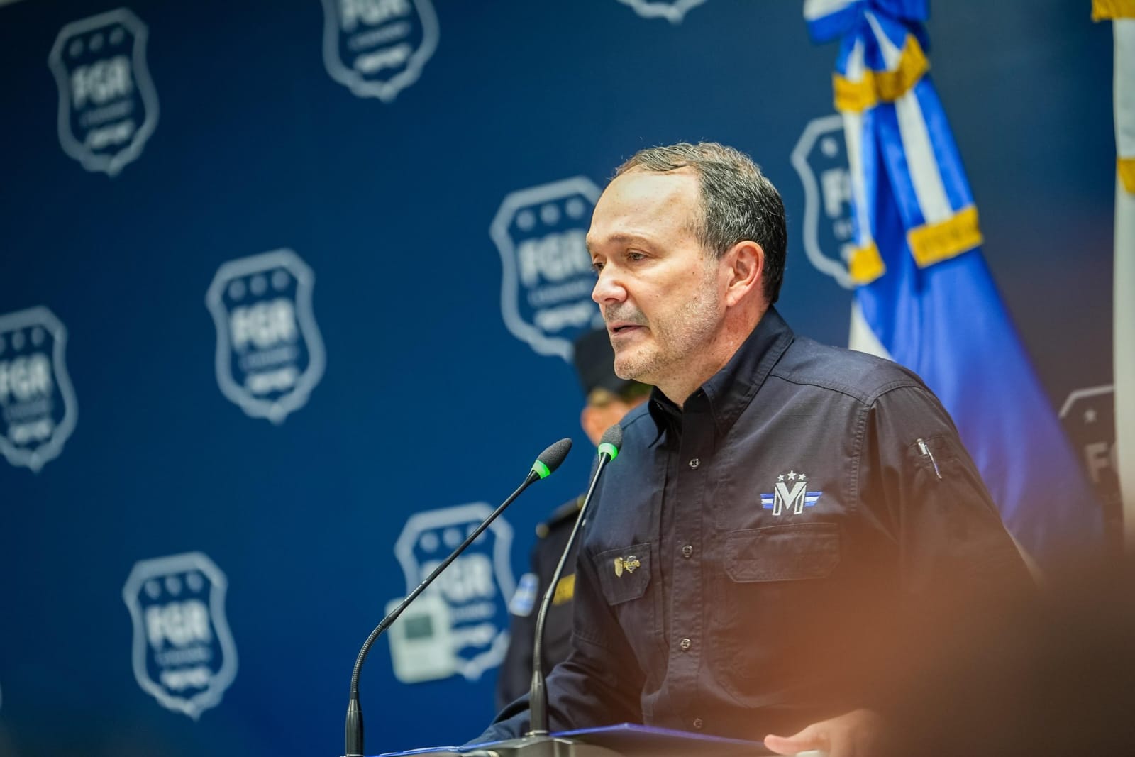El ministro de Justicia y Seguridad Pública, Gustavo Villatoro, junto al fiscal general Rodolfo Delgado, presentaron este martes los resultados de la operación “Escudo Virtual”, que permitió desarticular una red transnacional de estafa y extorsión en línea.