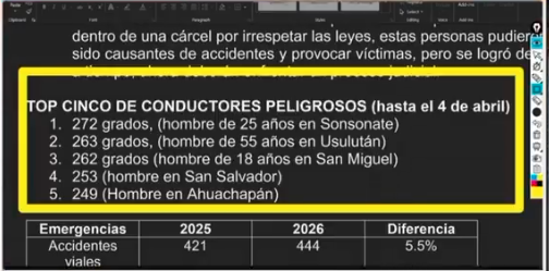 El Salvador. — Las autoridades de tránsito revelaron los casos con mayores niveles de alcohol detectados en pruebas realizadas a conductores en distintos puntos del país, evidenciando el alto riesgo que representa manejar bajo los efectos de bebidas alcohólicas.