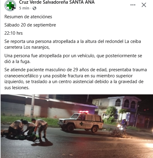 Santa Ana. Una persona resultó gravemente lesionada tras ser atropellada por un vehículo cuyo conductor se dio a la fuga en las inmediaciones del redondel La Ceiba, carretera a Los Naranjos, en Santa Ana.