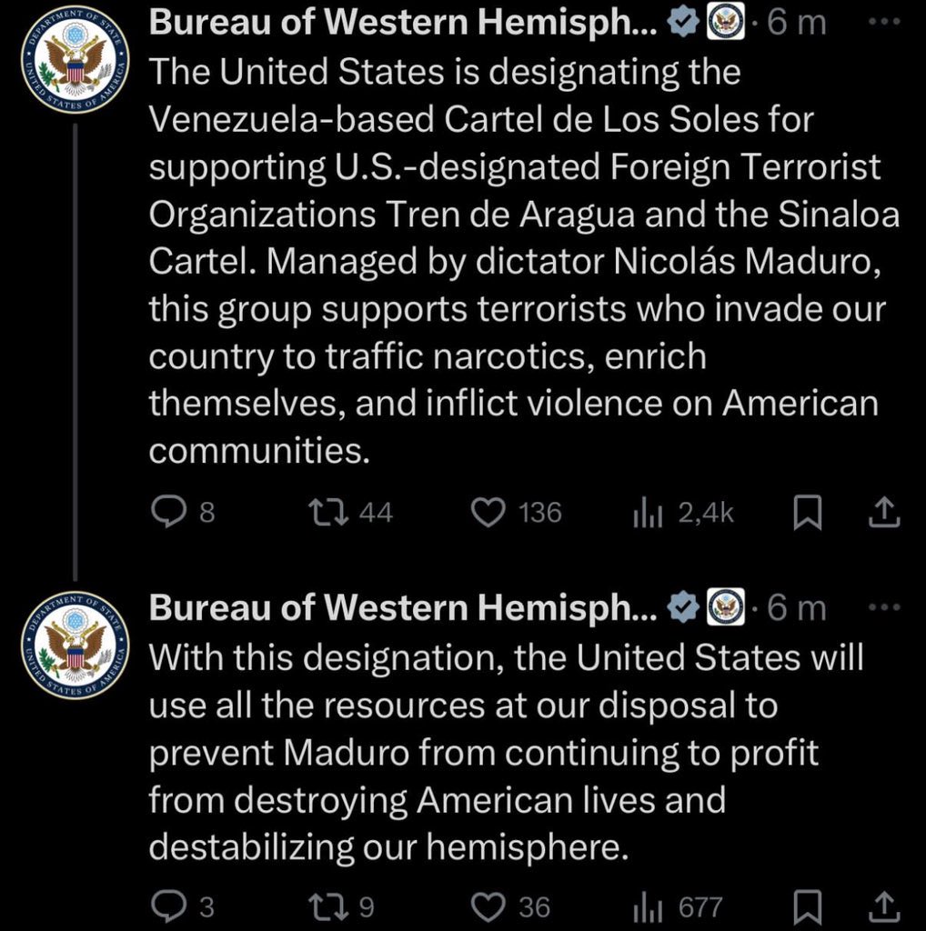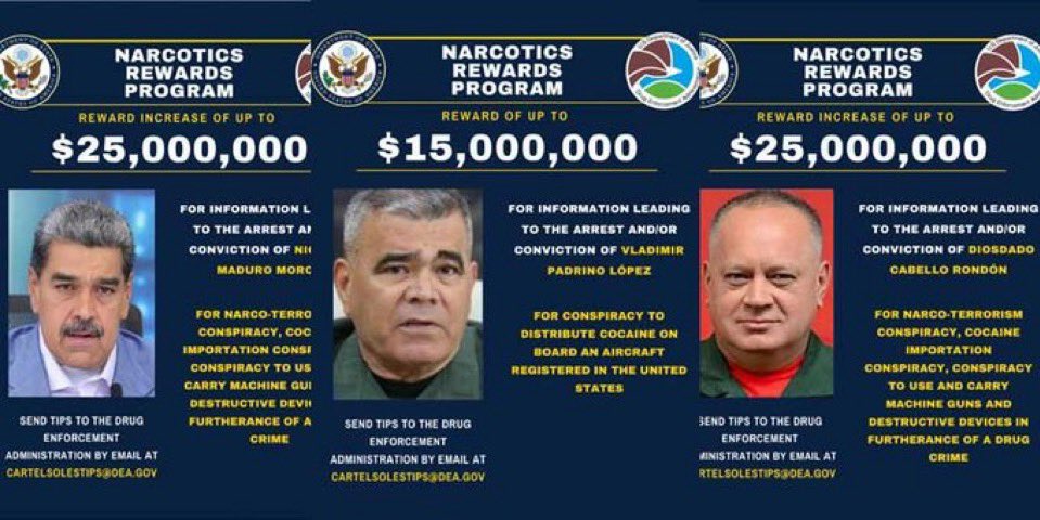 El gobierno de Estados Unidos ha acusado directamente al presidente venezolano, Nicolás Maduro, de encabezar una red de narcotráfico internacional conocida como el Cartel de Los Soles, y de brindar apoyo a grupos criminales considerados como organizaciones terroristas, entre ellos el Tren de Aragua y el Cartel de Sinaloa.