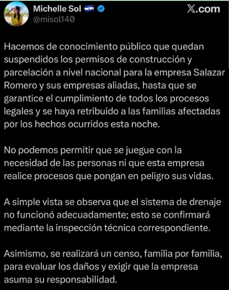 San Salvador. El Gobierno de El Salvador suspendió de forma inmediata y a nivel nacional los permisos de construcción y parcelación otorgados a la empresa Salazar Romero y a sus empresas aliadas, tras una emergencia registrada en un complejo habitacional afectado por inundaciones, informó la ministra de Vivienda, Michelle Sol.