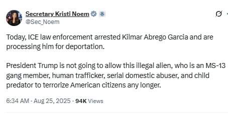 La secretaria de Seguridad de Estados Unidos, Kristy Noem, confirmó este lunes a través de la red X que agentes de la Oficina de Inmigración y Control de Aduanas (ICE) arrestaron a Kilmar Ábrego García, señalado como miembro de la pandilla MS-13.