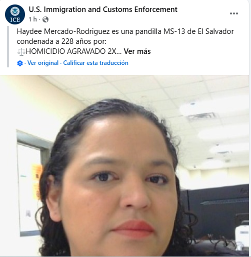 El Servicio de Inmigración y Control de Aduanas (ICE) informó sobre la detención de Haydee Mercado-Rodríguez, ciudadana salvadoreña condenada en su país por diversos delitos.