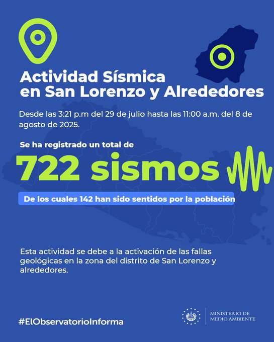 El Observatorio de Amenazas del Ministerio de Medio Ambiente informó que, entre las 3:21 p. m. del 29 de julio y las 11:00 a. m. de este 8 de agosto de 2025, se han contabilizado 722 sismos en el distrito de San Lorenzo, Ahuachapán, y sus alrededores.