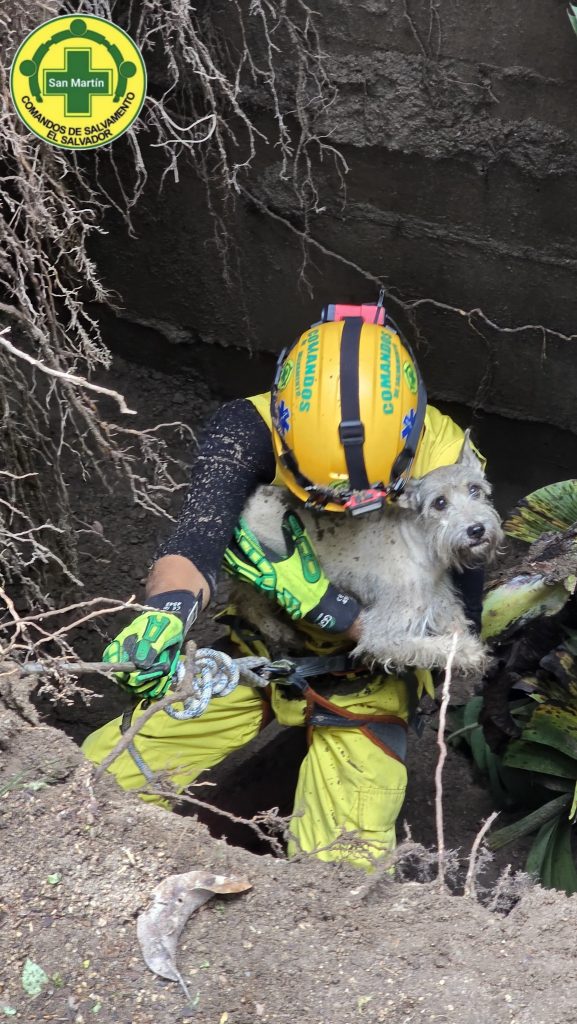 San Salvador – Comandos de Salvamento de San Martín logró el rescate exitoso de un perro que había caído en una cárcava de aproximadamente tres metros de profundidad dentro de una vivienda en la urbanización Nuevos Horizontes.