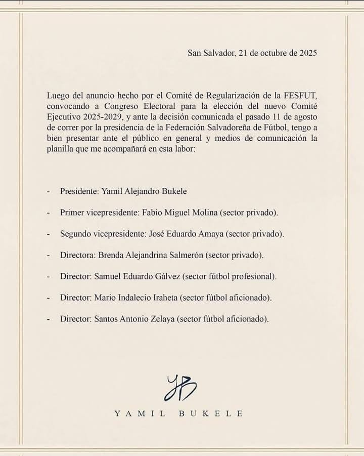 El presidente del Instituto Nacional de los Deportes de El Salvador (INDES), Yamil Bukele, presentó oficialmente su planilla para competir por la Presidencia del Comité Ejecutivo de la Federación Salvadoreña de Fútbol (FESFUT) para el periodo 2025-2029.